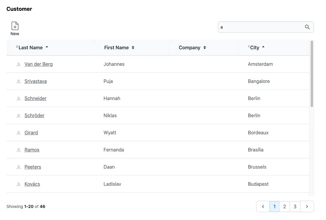 FFTable is the best feature of Fuwafuwa Framework. This feature allows you to quickly build nice, responsive table view of selected fields in a table. It provides multiple fields sorting, searching, formatting, pagination, add/modify record. Let's review Customer view in Chinook sample aplication.